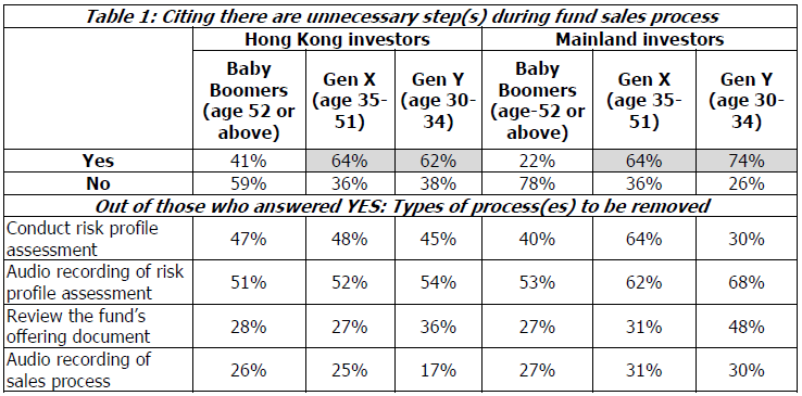 Similarly, 54% of Mainland investors regard that some steps can be removed, with most see audio-recording of risk profile assessment as being redundant.